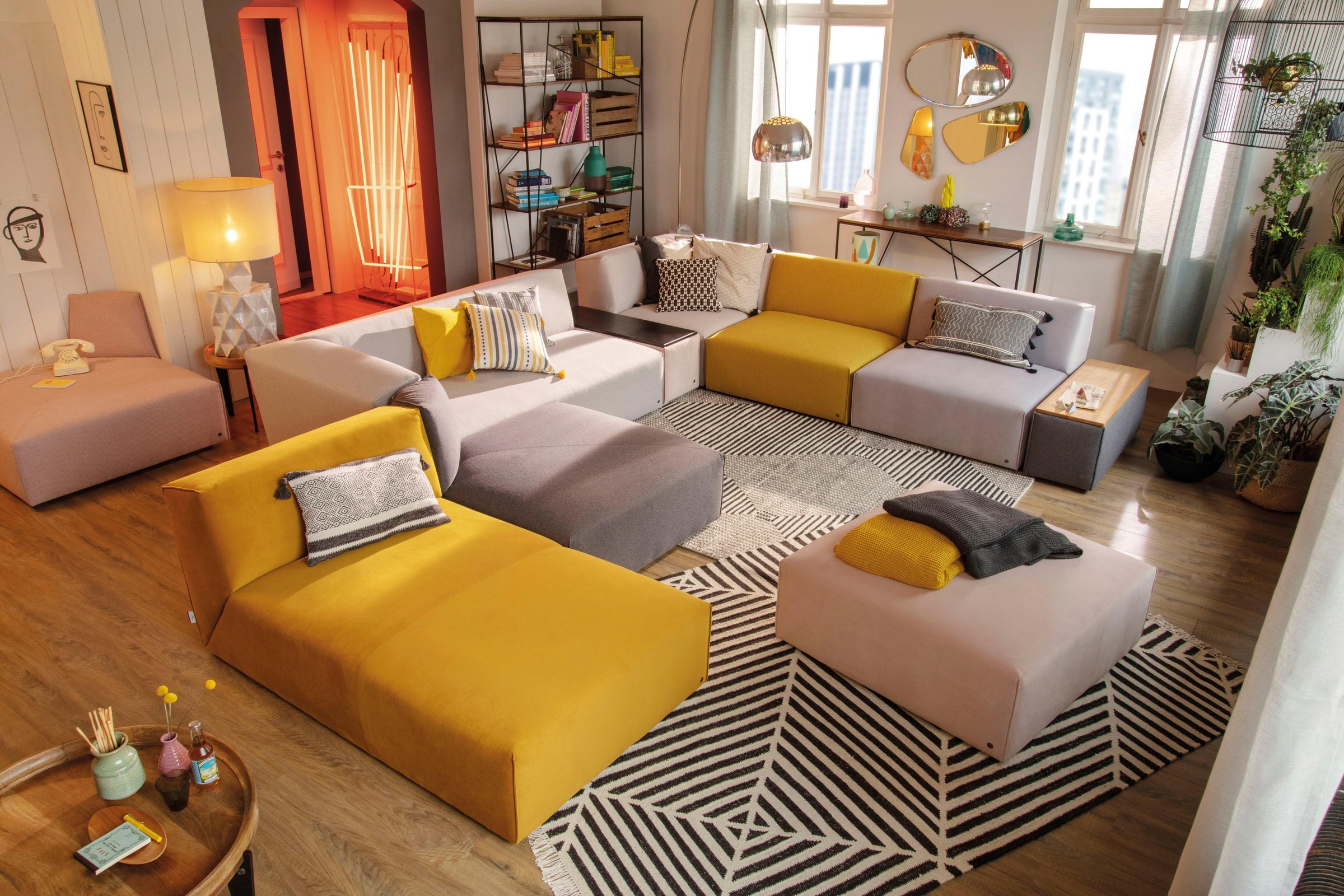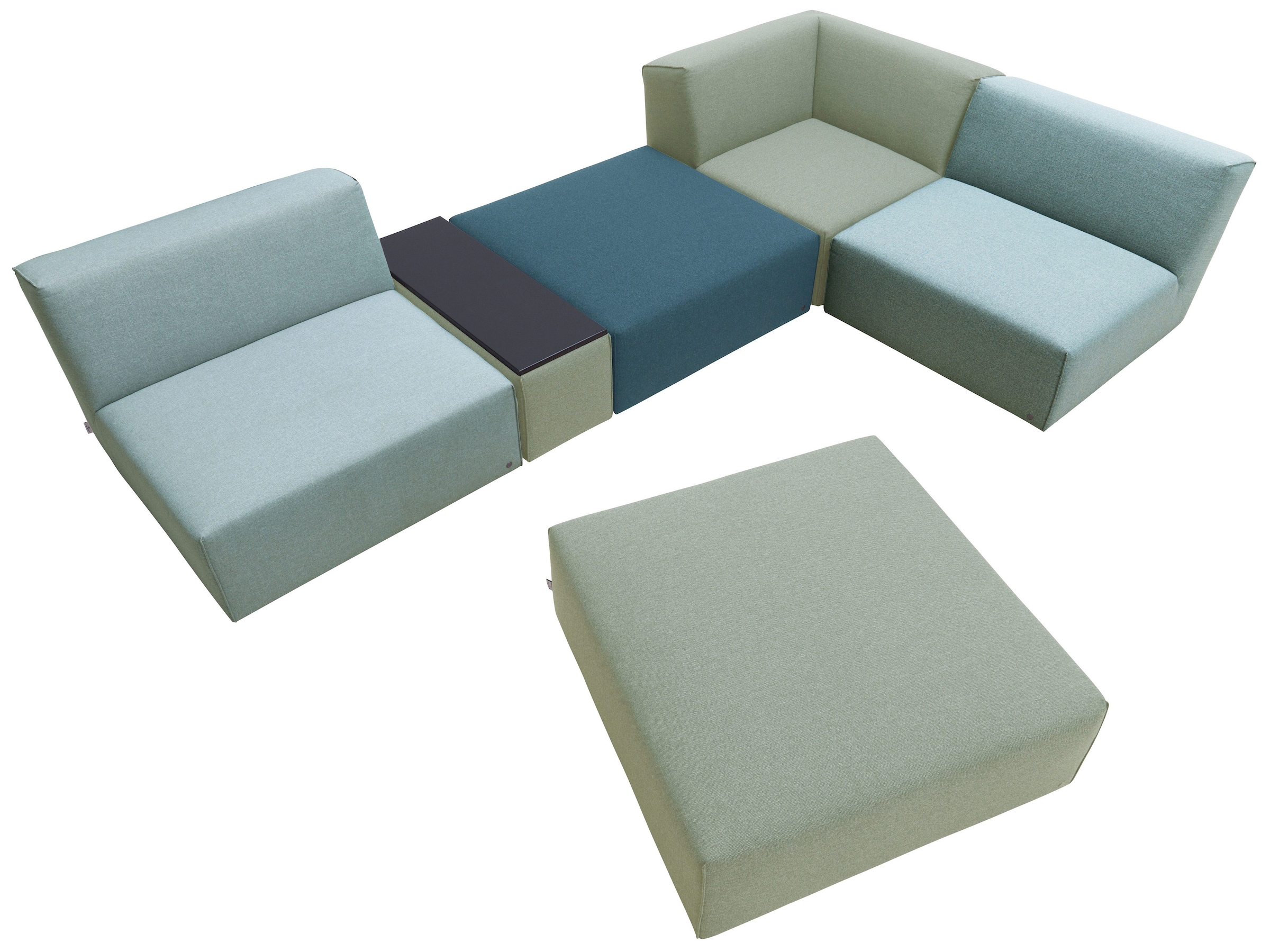 Aus hocker, einzelelement und eckelement lassen sich vielfältige sofaarrangements bilden.
